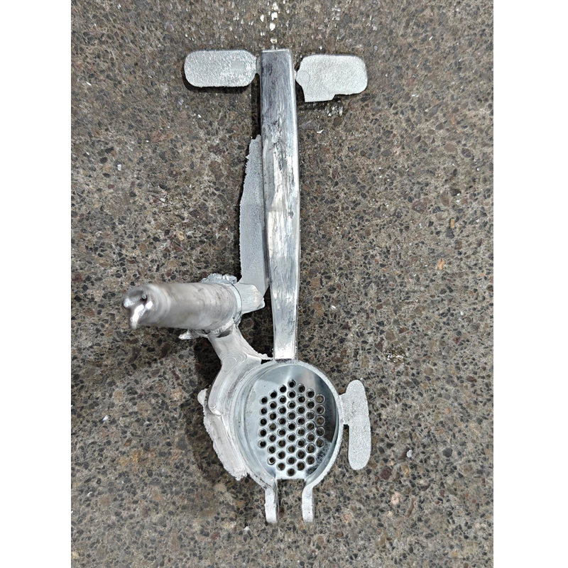Imaginea 1 arată starea de turnare brută a presei de usturoi. După prelucrarea brută, aceasta este lustruită manual. Imaginea 3 prezintă apoi piesa după ce a fost tratată printr-o linie de producție automată de galvanizare la temperatură înaltă de 180 de grade. În cele din urmă, componentele calificate sunt asamblate.