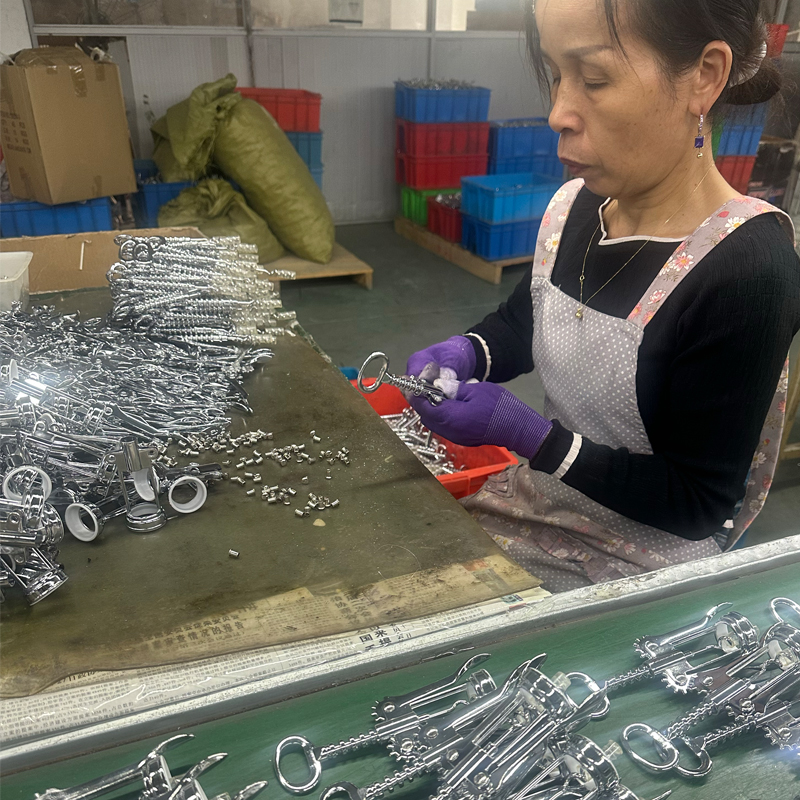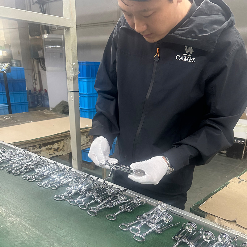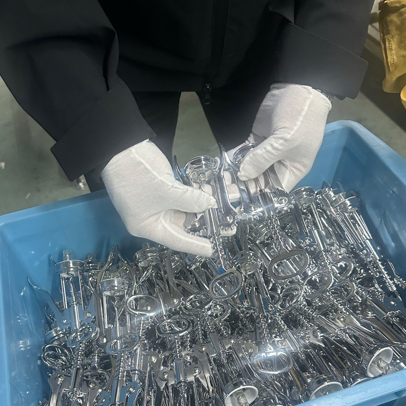 Acoperirile tuturor componentelor tirbușonului utilizează de obicei metode de galvanizare sau vopsire, pentru această ilustrație, ne vom concentra pe galvanizare. Procesarea galvanizării este finalizată de un furnizor externalizat, care necesită facilități, echipamente și ingineri din industrie foarte specializate cu ani de experiență în domeniul lor, împreună cu numeroși tehnicieni de bază și muncitori cu experiență. de experiență în industrie, asigurând stabilitatea produsului. Acest lucru asigură, de asemenea, că diferitele probleme de producție întâlnite în timpul producției pot fi rezolvate rapid, profesional și eficient. Aceste aranjamente ajută la asigurarea ciclurilor de producție pentru articole precum accesorii pentru vin, ustensile de bucătărie și tirbușon, în același timp sprijinind planurile de vânzări ale clienților.