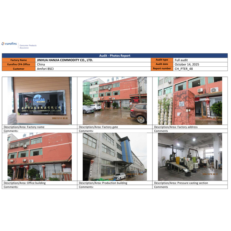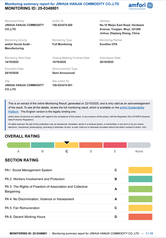 Jinhua Hanjia commodity Co., Ltd. a publicat rezultatele auditului său BSCI. Pe 14 octombrie, compania a trecut cu succes de evaluarea profesională și a obținut o certificare de Clasa C, care îndeplinește cerințele minime specificate de client. Perioada de valabilitate a acestei certificări este de un an. Auditul BSCI a fost efectuat de agenția EUROFINS selectată de client și a achiziționat accesorii de vin și produse din oțel inoxidabil deschise de client. cum ar fi shakerul de cocktail de la compania noastră pentru o lungă perioadă de timp. Țara clientului cere furnizorilor să posede această certificare.